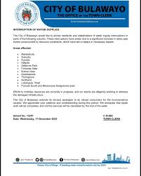BULAWAYO— The City of Bulawayo is grappling with significant water supply interruptions across key areas, including Mzilikazi, Suburbs, Kumalo, and several others, as indicated in a recent advisory from the Office of the Town Clerk.
