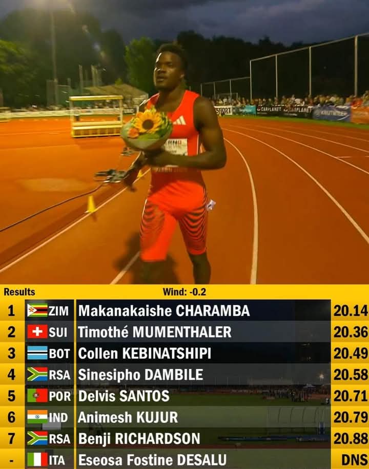 Charamba clocked an impressive 20.14 seconds to edge out European champion Timothé Mumenthaler, who settled for second place with a time of 20.36s. The result marks yet another milestone in what has been a breakthrough season for the Zimbabwean sprinter, solidifying his growing reputation on the international athletics stage.